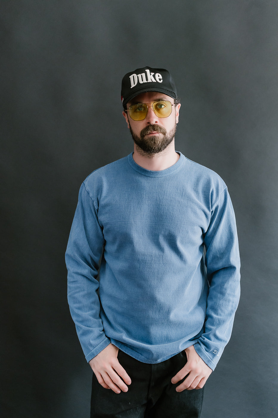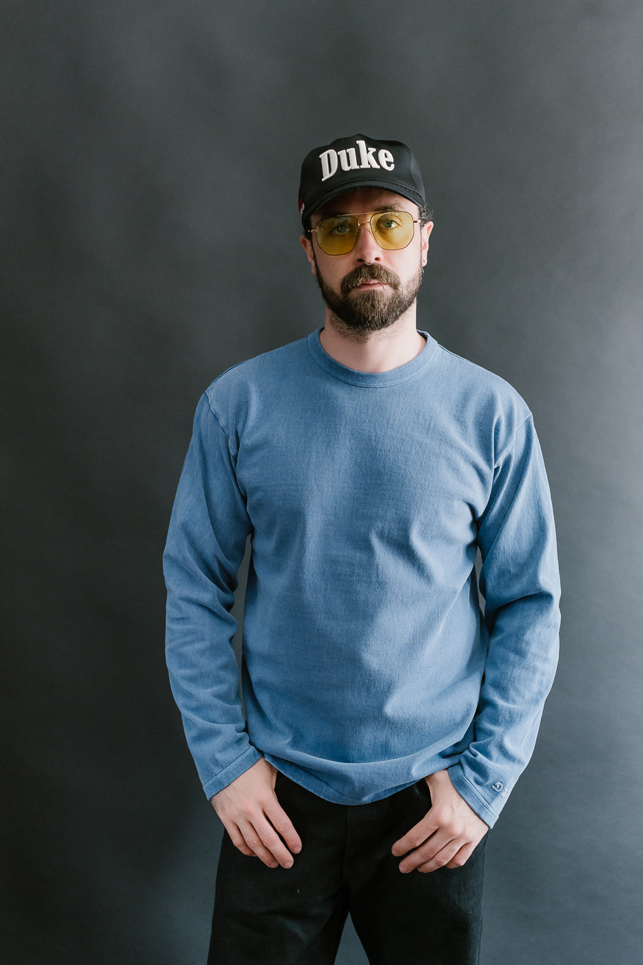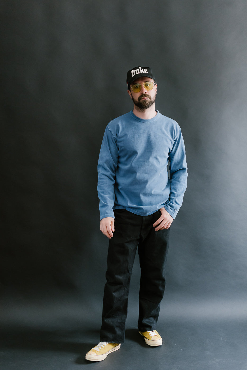 We love the utility of a long-sleeved shirt. Whether for a layer of comfort under a wool CPO or a way to upgrade your standard tee, these "Stand Wheel" shirts are a wonderful option. Typically, a heavyweight shirt is stiff and more difficult to wear, but the stand-wheeler machine creates a loosely woven, softer fabric. They've also taken the additional step of binding the cuffs and hem instead of sewing them on. This significantly increases the life of the ribs. The pigment-dyed variations are absolutely stunning in person. This heavyweight fabric takes the dye in a way that makes it look immediately vintage. The light indigo option is such a stunning shade of blue. They've polished this piece with a pretty little chainstitch style DW on the sleeve.