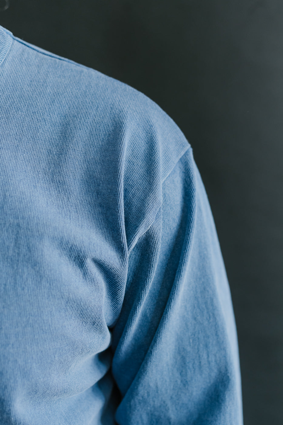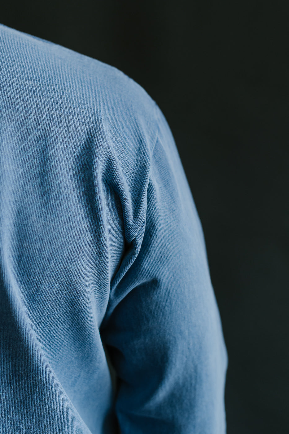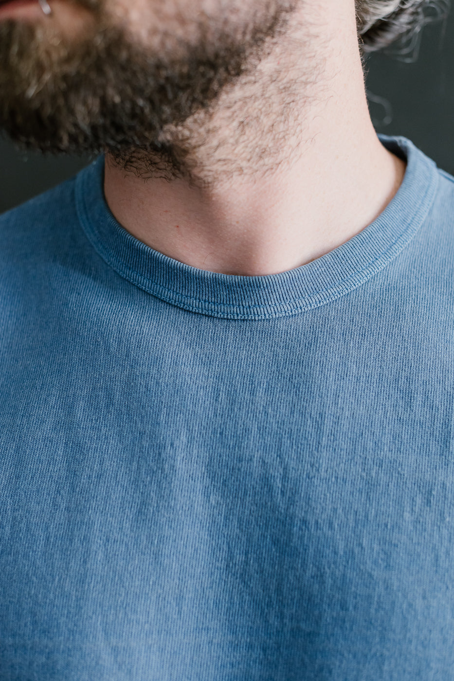 We love the utility of a long-sleeved shirt. Whether for a layer of comfort under a wool CPO or a way to upgrade your standard tee, these "Stand Wheel" shirts are a wonderful option. Typically, a heavyweight shirt is stiff and more difficult to wear, but the stand-wheeler machine creates a loosely woven, softer fabric. They've also taken the additional step of binding the cuffs and hem instead of sewing them on. This significantly increases the life of the ribs. The pigment-dyed variations are absolutely stunning in person. This heavyweight fabric takes the dye in a way that makes it look immediately vintage. The light indigo option is such a stunning shade of blue. They've polished this piece with a pretty little chainstitch style DW on the sleeve.