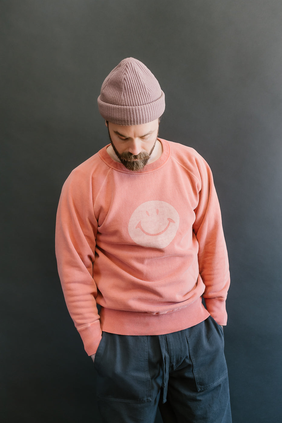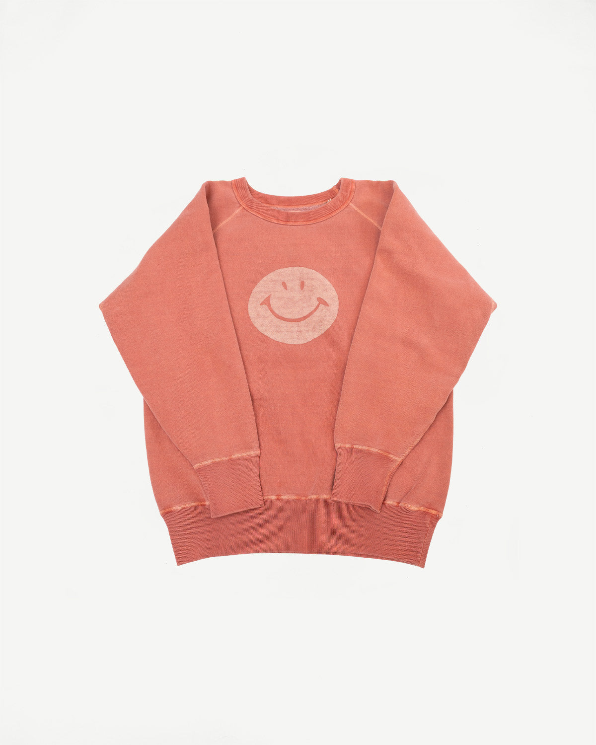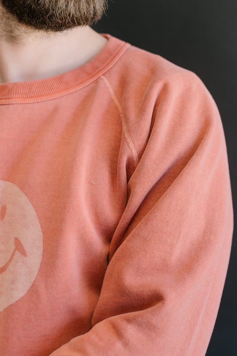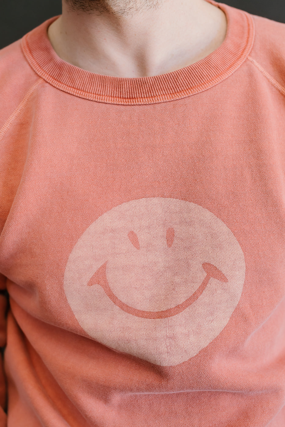 The standout feature is the faded smiley face print on the front, offering a playful nod to retro designs. The print's intentionally distressed appearance adds to the garment's vintage charm. Raglan sleeves contribute to a relaxed silhouette and unrestricted movement, while ribbed cuffs and hem maintain the sweatshirt's shape and provide a snug fit.