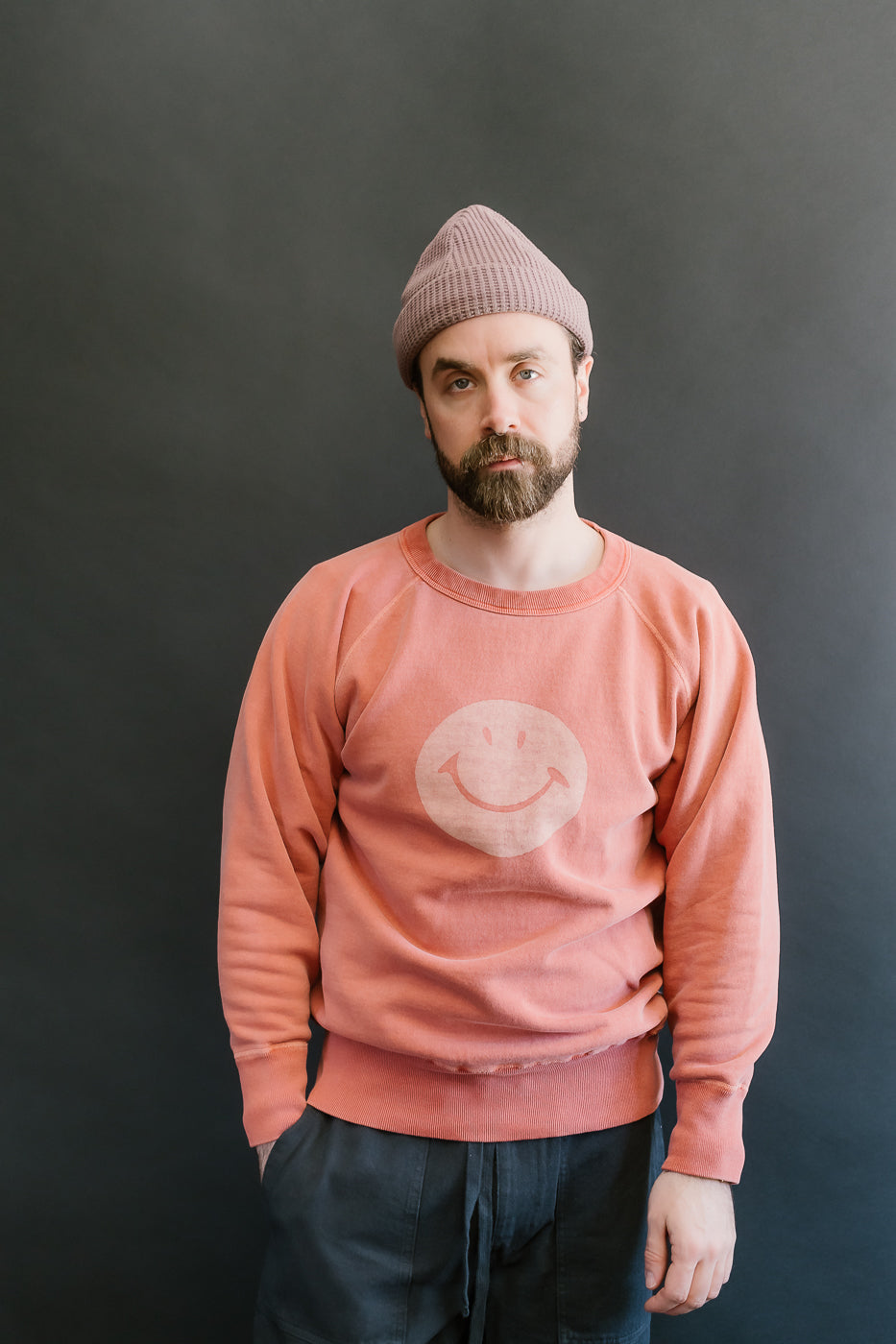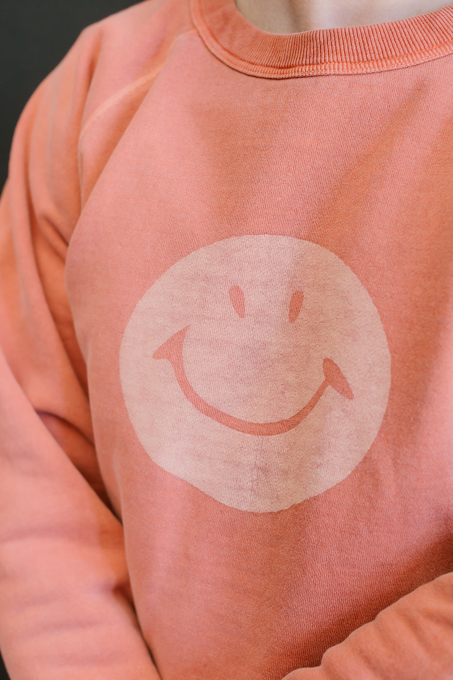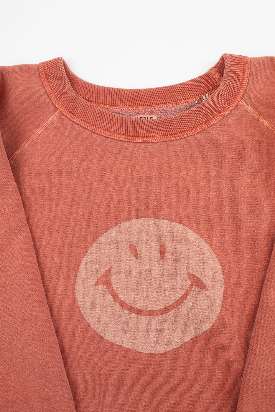 The standout feature is the faded smiley face print on the front, offering a playful nod to retro designs. The print's intentionally distressed appearance adds to the garment's vintage charm. Raglan sleeves contribute to a relaxed silhouette and unrestricted movement, while ribbed cuffs and hem maintain the sweatshirt's shape and provide a snug fit.