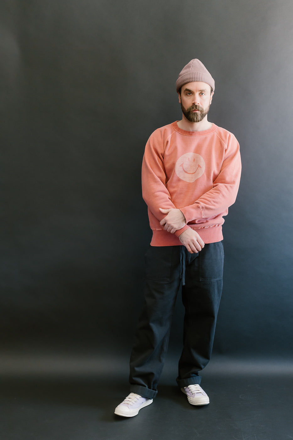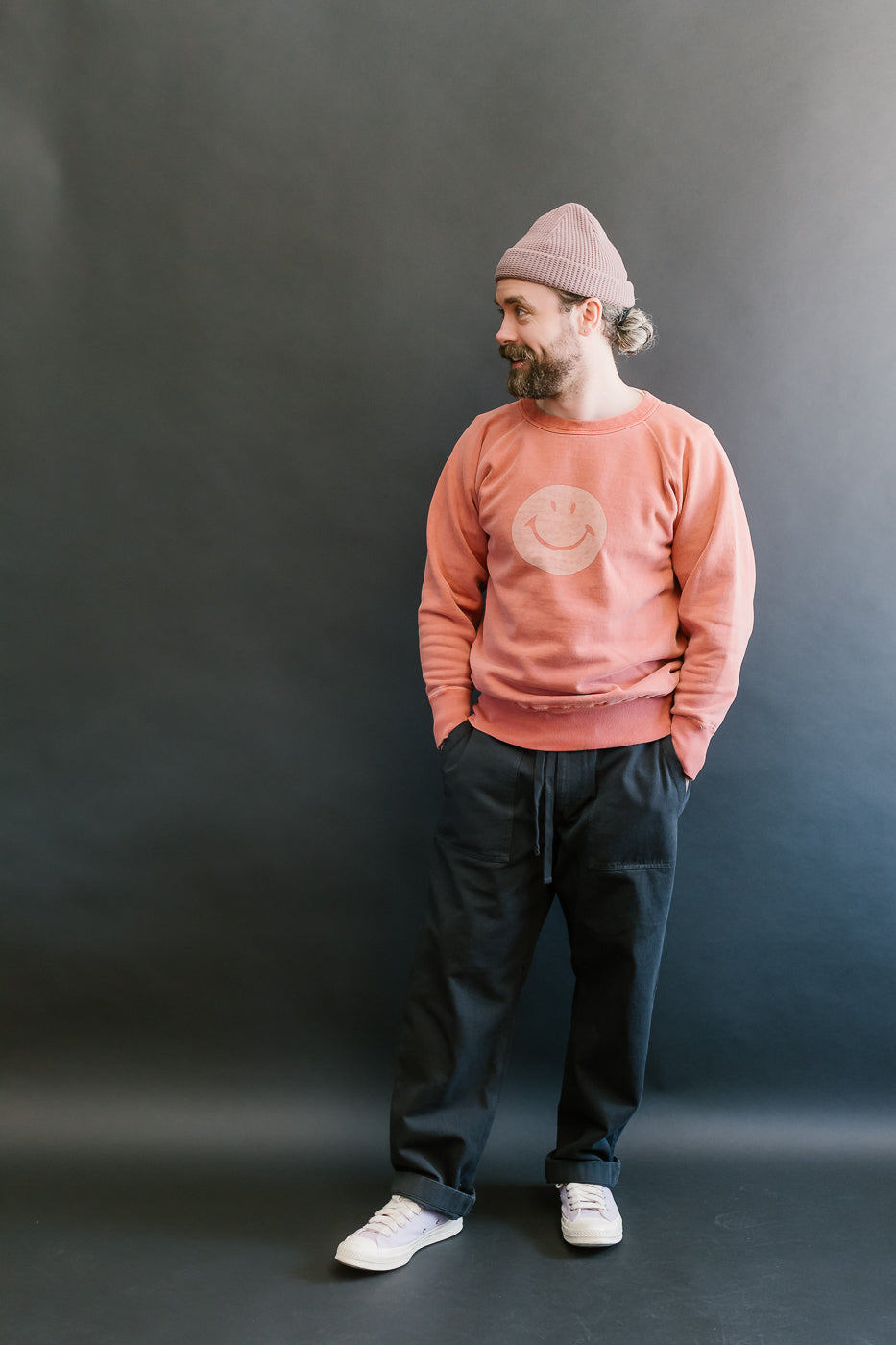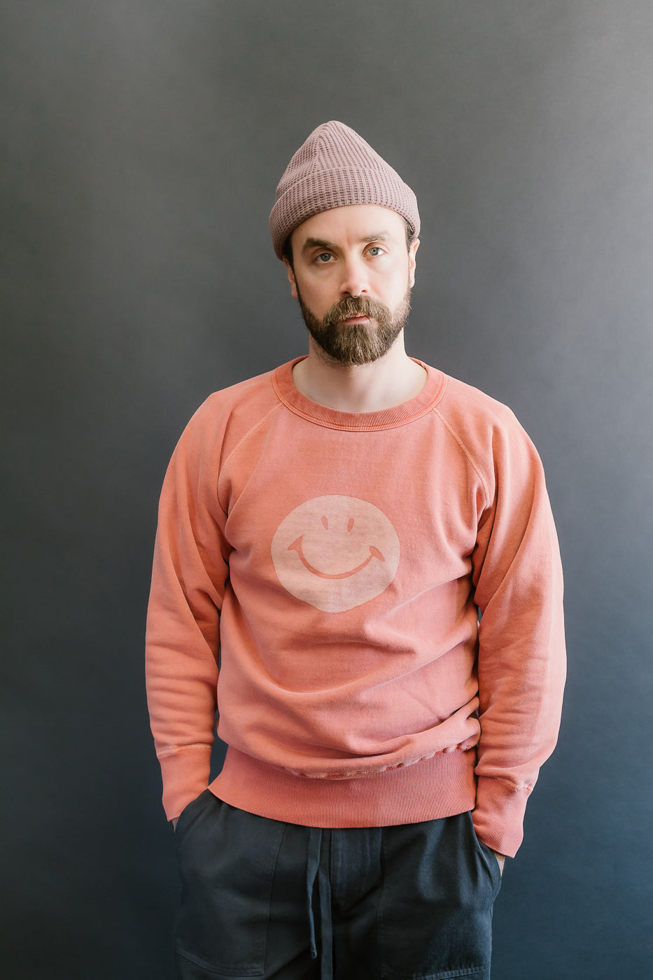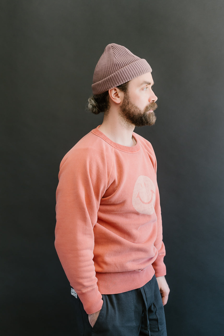 The standout feature is the faded smiley face print on the front, offering a playful nod to retro designs. The print's intentionally distressed appearance adds to the garment's vintage charm. Raglan sleeves contribute to a relaxed silhouette and unrestricted movement, while ribbed cuffs and hem maintain the sweatshirt's shape and provide a snug fit.
