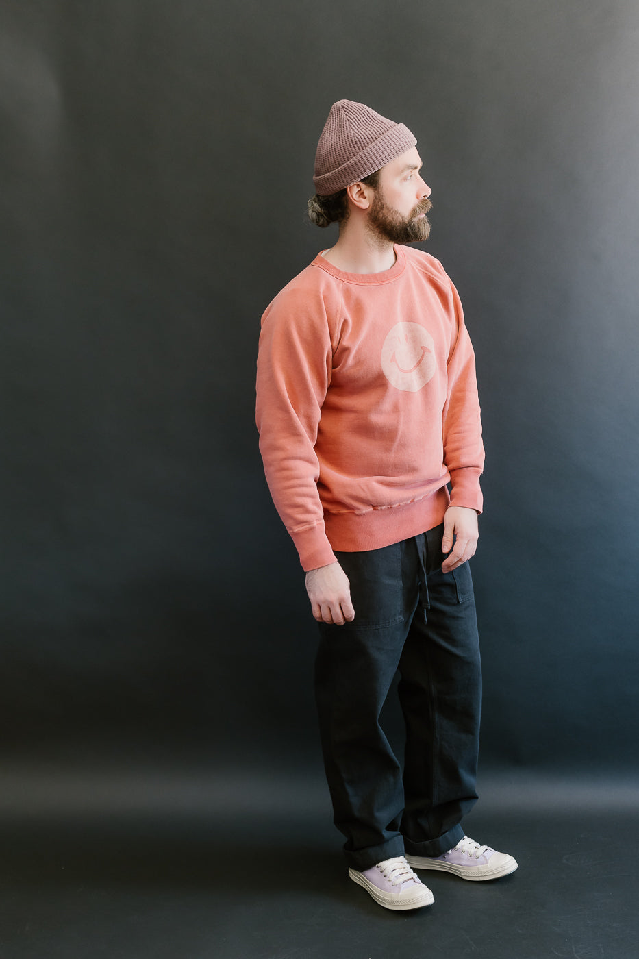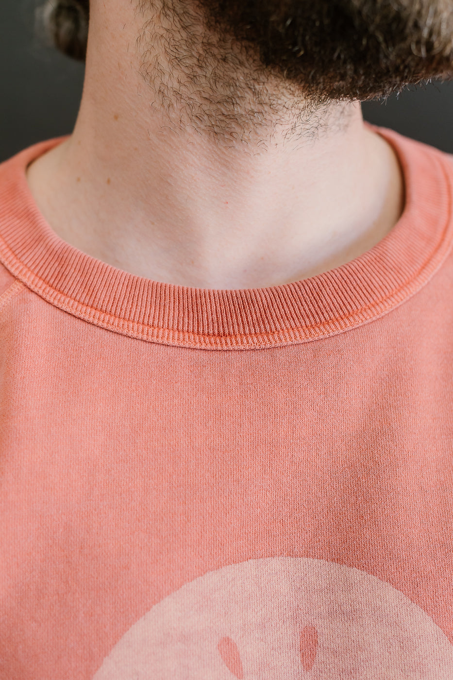 The Dubbleworks Smiley Face Faded Print Sweatshirt embodies the brand's commitment to vintage aesthetics and superior comfort. Crafted in Japan, this sweatshirt is made from 100% cotton, ensuring a soft and breathable feel. The loopwheel construction technique employed in its creation eliminates side seams, providing a seamless and comfortable fit that resists twisting over time.