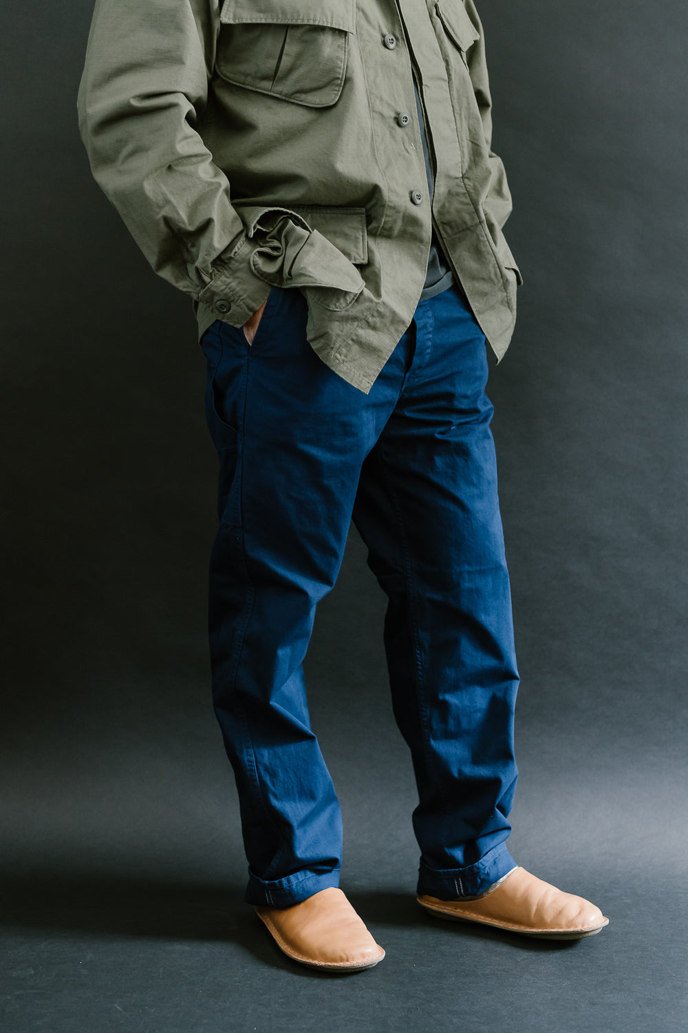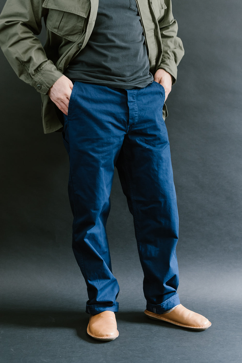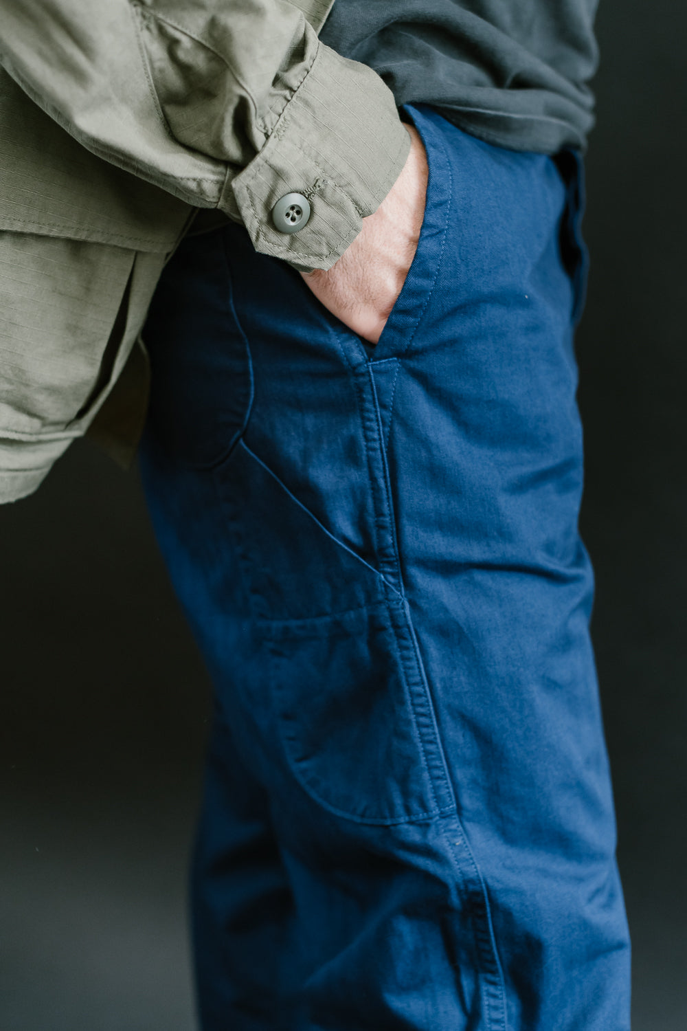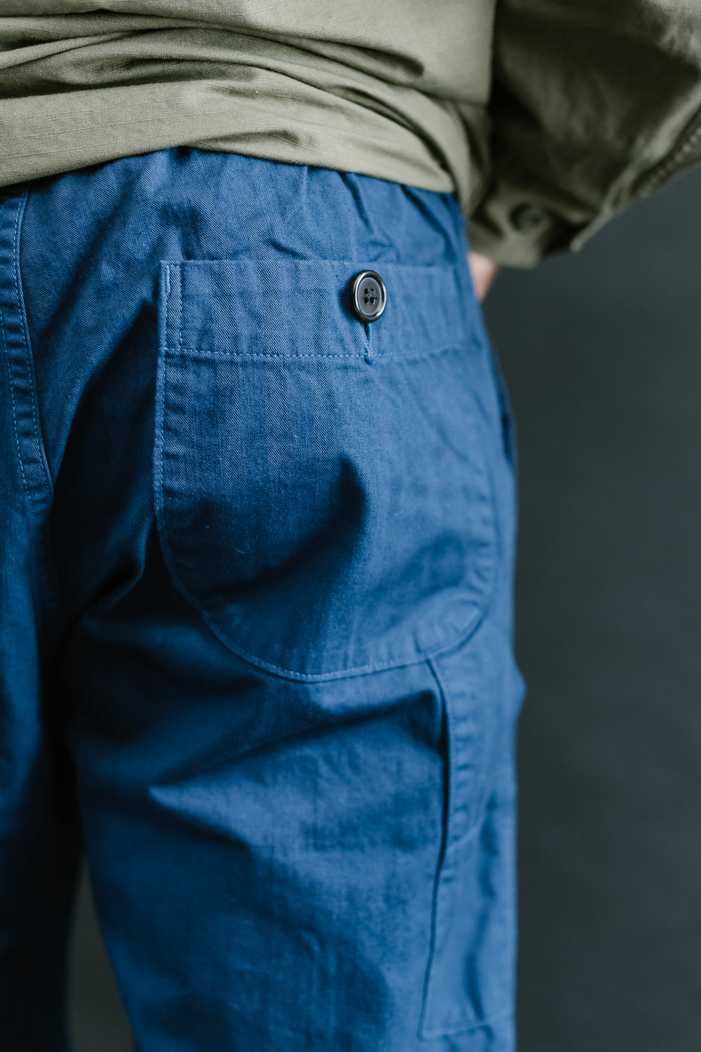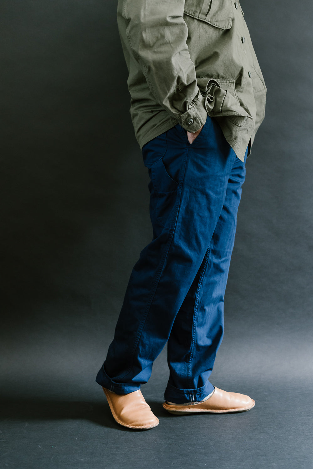We've got to admit, after nearly a decade of putting on stiff pants for photoshoots...it's quite nice to put something on like this. Feeling comfortable and mobile has become such an important part of our fashion sense in the previous 3 years. When we first put these on in 2020, we thought "man they're so roomy." Now we just take them as a classic, standard fit. The elastic waistband is a dream. The fit in the legs is a dream. It has a vertical herringbone pattern that you can really only see up close. The button fly and a tool pouch on the side make these a classic French work pant. And this color is one we wanted from the beginning, and just finally had the gusto to bring into the shop. We're kicking ourselves that we didn't do it sooner.