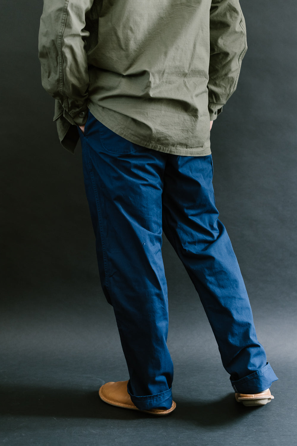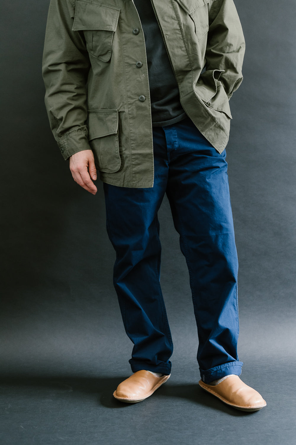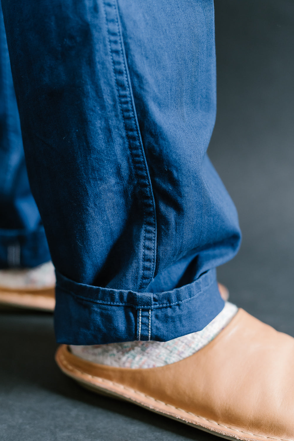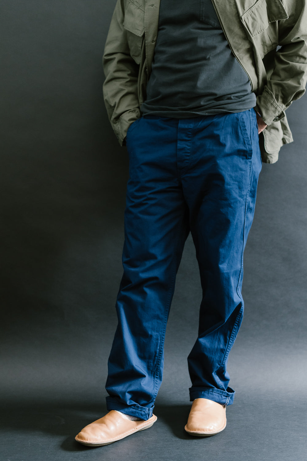 We've got to admit, after nearly a decade of putting on stiff pants for photoshoots...it's quite nice to put something on like this. Feeling comfortable and mobile has become such an important part of our fashion sense in the previous 3 years. When we first put these on in 2020, we thought "man they're so roomy." Now we just take them as a classic, standard fit. The elastic waistband is a dream. The fit in the legs is a dream. It has a vertical herringbone pattern that you can really only see up close. The button fly and a tool pouch on the side make these a classic French work pant. And this color is one we wanted from the beginning, and just finally had the gusto to bring into the shop. We're kicking ourselves that we didn't do it sooner.