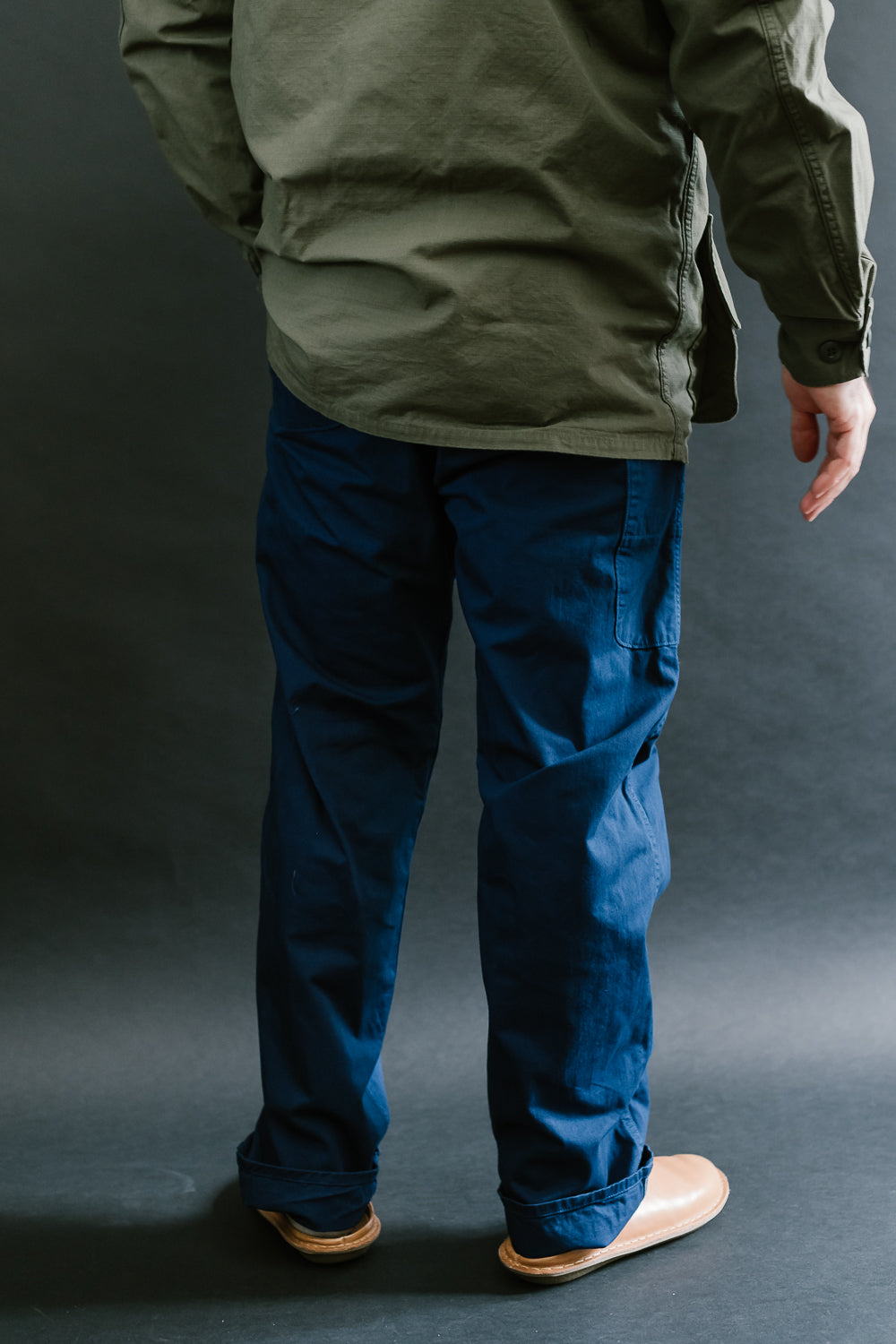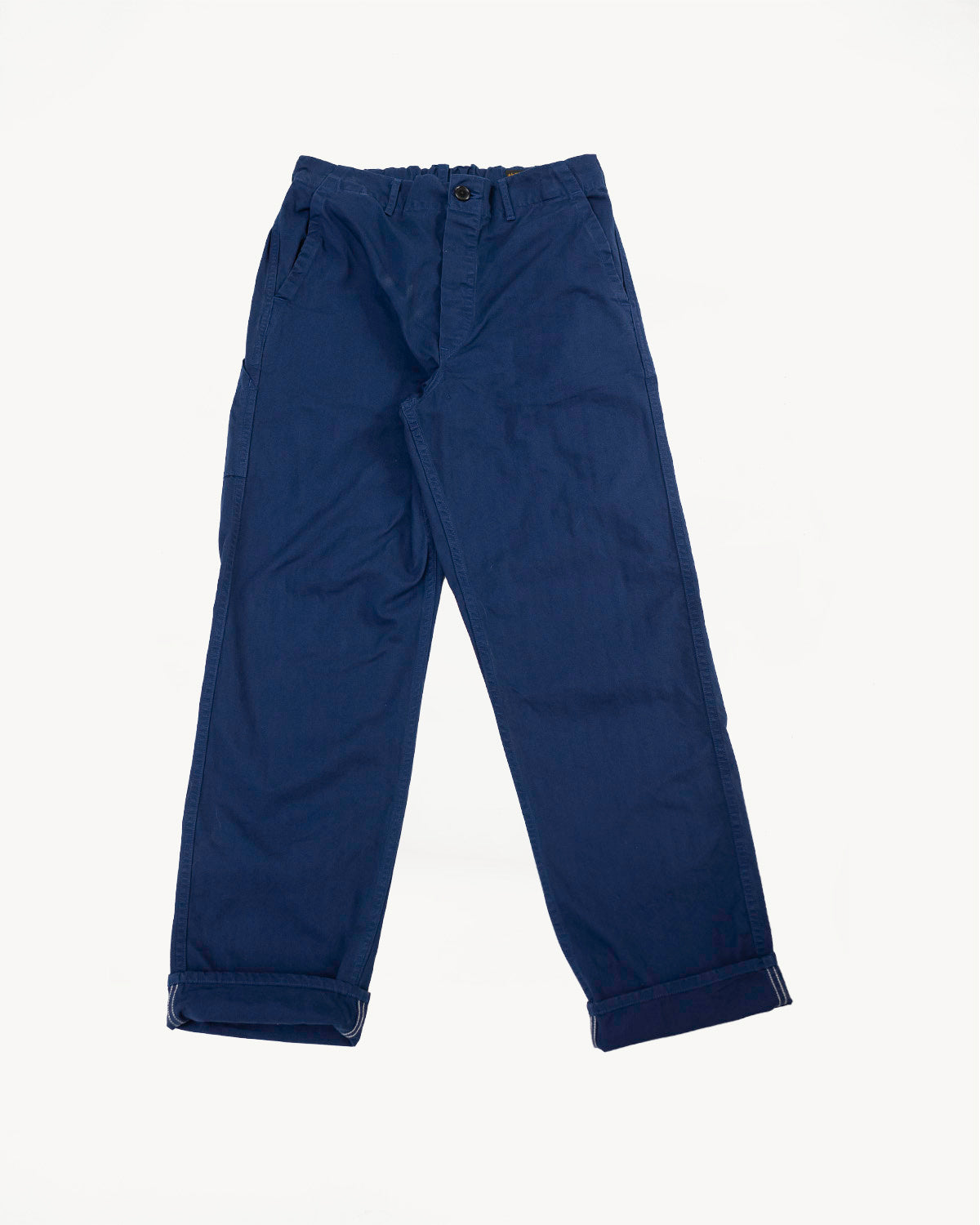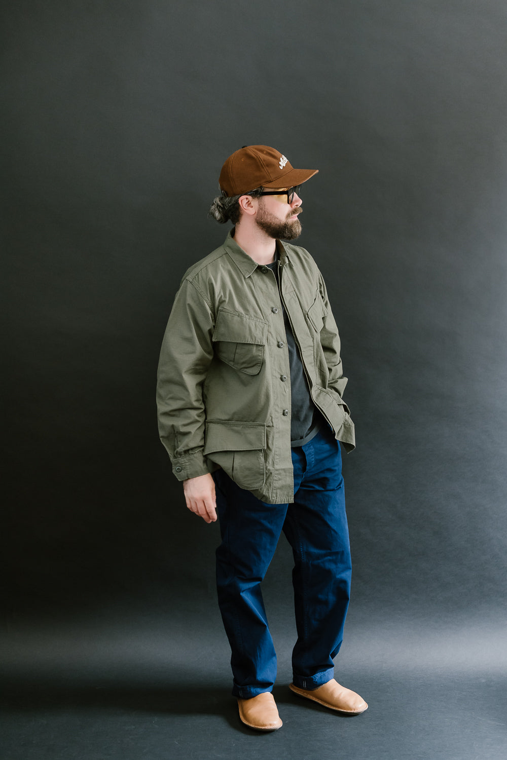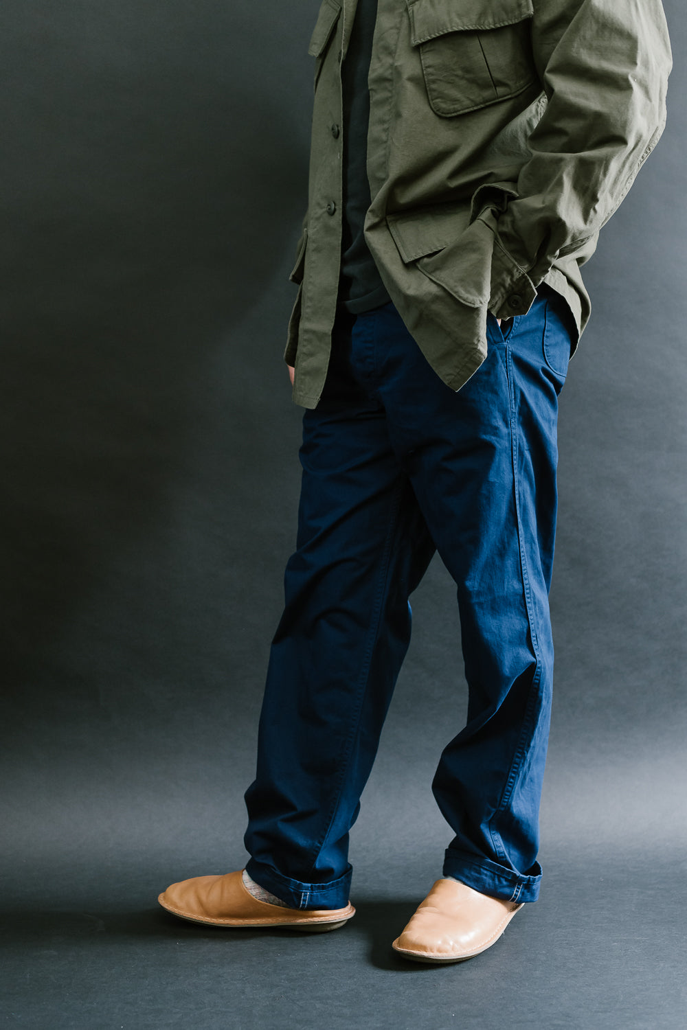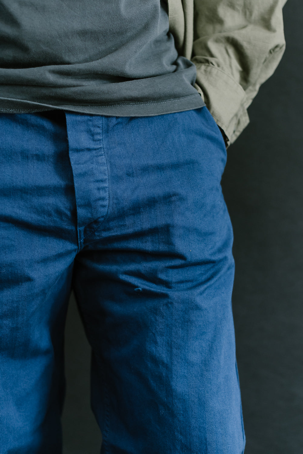 We've got to admit, after nearly a decade of putting on stiff pants for photoshoots...it's quite nice to put something on like this. Feeling comfortable and mobile has become such an important part of our fashion sense in the previous 3 years. When we first put these on in 2020, we thought "man they're so roomy." Now we just take them as a classic, standard fit. The elastic waistband is a dream. The fit in the legs is a dream. It has a vertical herringbone pattern that you can really only see up close. The button fly and a tool pouch on the side make these a classic French work pant. And this color is one we wanted from the beginning, and just finally had the gusto to bring into the shop. We're kicking ourselves that we didn't do it sooner.
