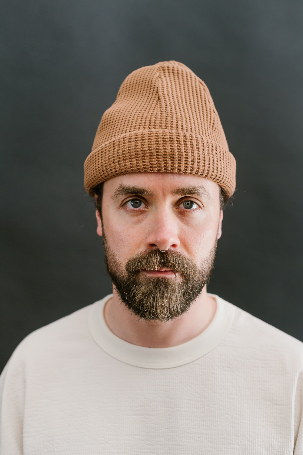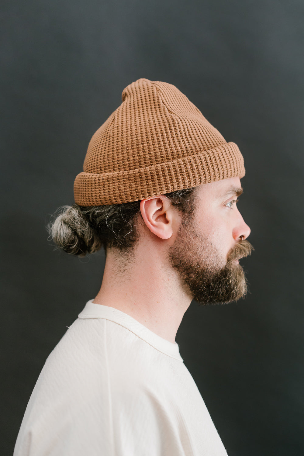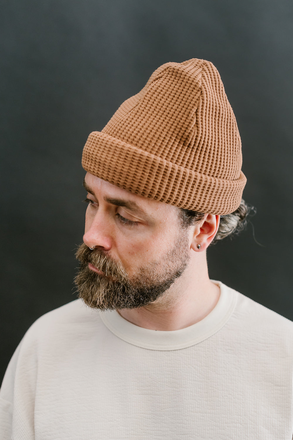 Jackman grabbed our attention right away. The fabrics are on a whole other level, including these waffle knit caps. The 100% cotton waffle design will blow your mind. You're going to think there's stretch in the cap, but that is just how insanely good they are with technical natural knits in Japan. It is unlike anything we've ever felt. They are also made longer than a typical beanie we purchase. It makes this cap so versatile because if you don't like a watch cap look, you can wear it with just one roll. It also fits a huge variety of heads! These waffle caps have quickly become our favorite in the store. We love the way this light brown iteration called "Cocoa" pairs with everything.