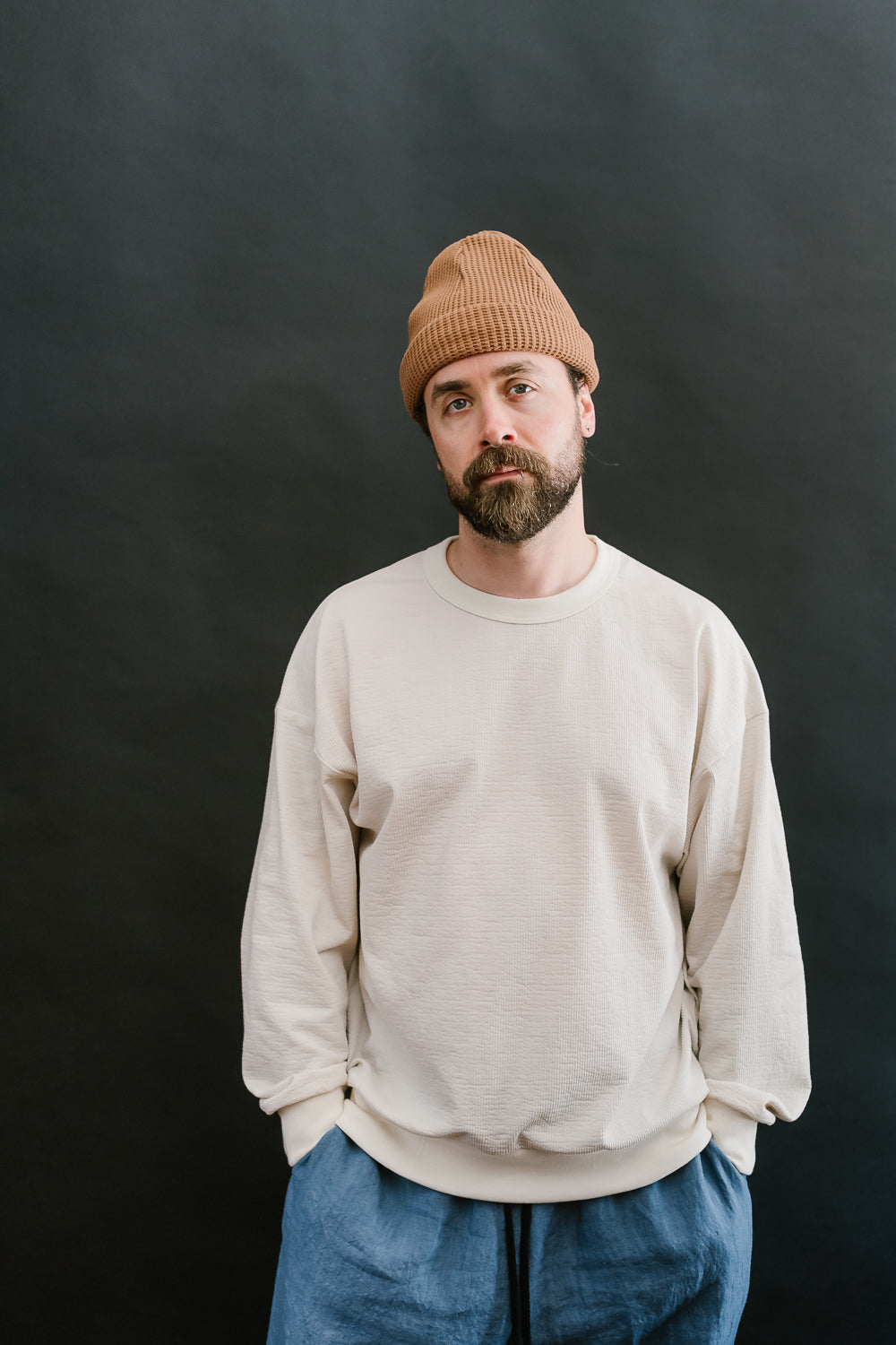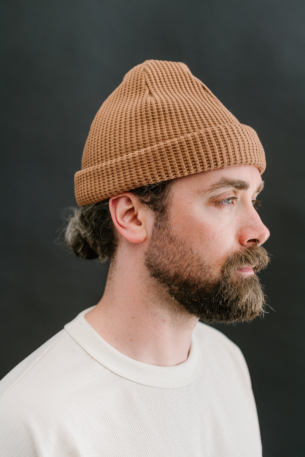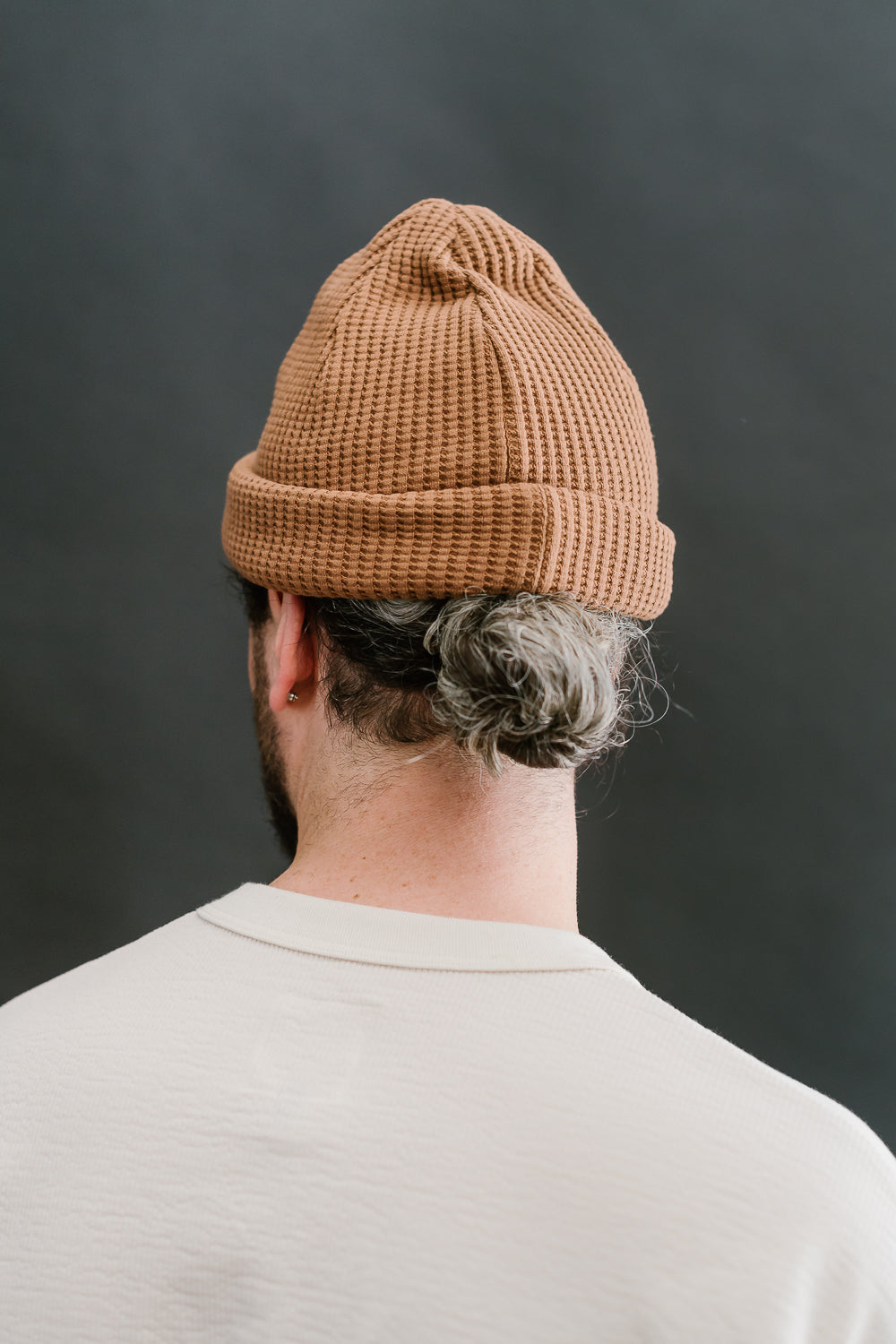 Jackman grabbed our attention right away. The fabrics are on a whole other level, including these waffle knit caps. The 100% cotton waffle design will blow your mind. You're going to think there's stretch in the cap, but that is just how insanely good they are with technical natural knits in Japan. It is unlike anything we've ever felt. They are also made longer than a typical beanie we purchase. It makes this cap so versatile because if you don't like a watch cap look, you can wear it with just one roll. It also fits a huge variety of heads! These waffle caps have quickly become our favorite in the store. We love the way this light brown iteration called "Cocoa" pairs with everything.