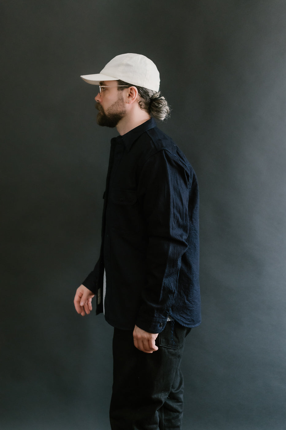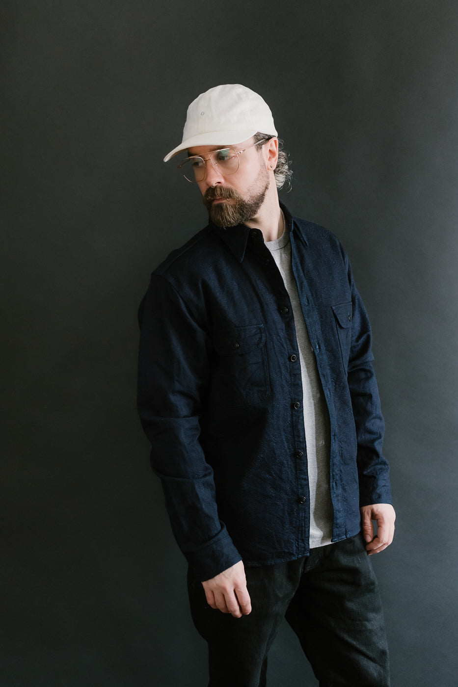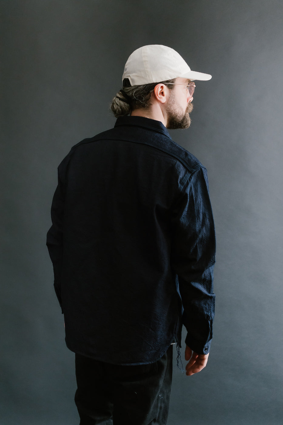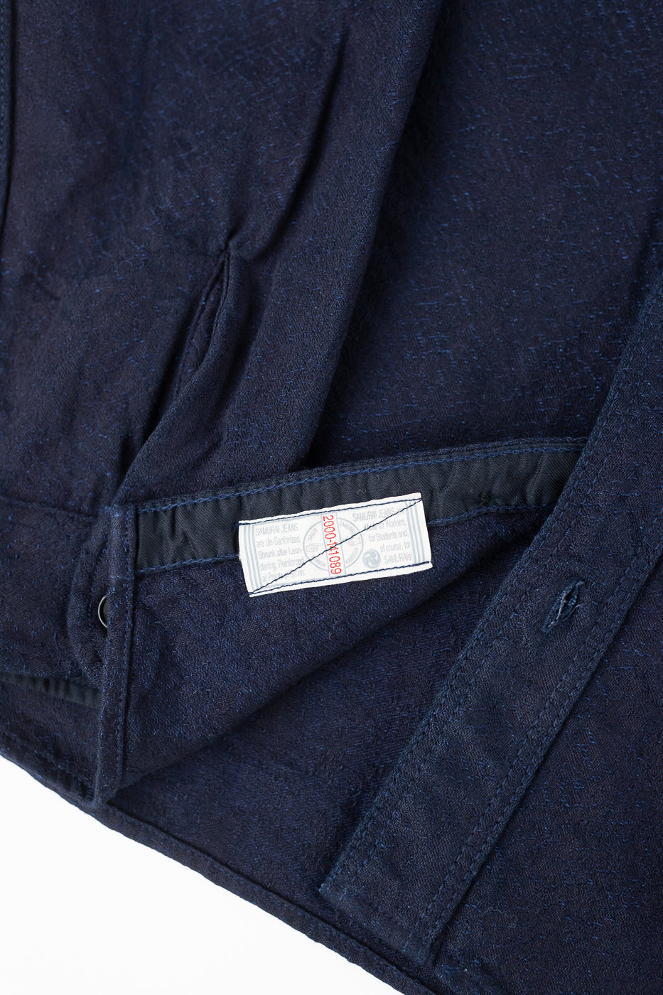 Samurai’s SSS25-01W is a one-wash work shirt crafted from a medium-weight, natural indigo-dyed jacquard fabric. The intricate snakeskin pattern, woven directly into the material using 16-count and 10-count yarns, subtly reveals itself over time as the indigo fades, celebrating the Chinese Year of the Snake. This shirt combines traditional Japanese craftsmanship with classic workwear details, featuring triple-needle chainstitch construction, selvedge gussets with chainstitch runoff, and indigo-dyed nut buttons. Designed with a Western fit, it offers a truer-to-size experience compared to other Samurai upper garments.